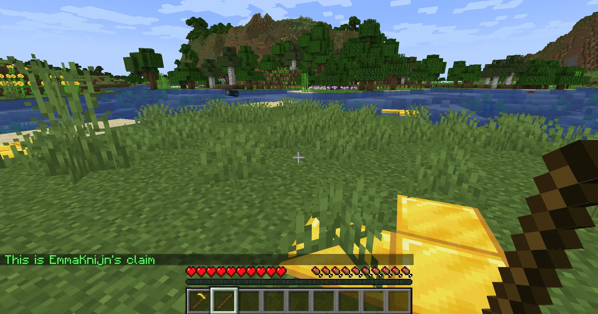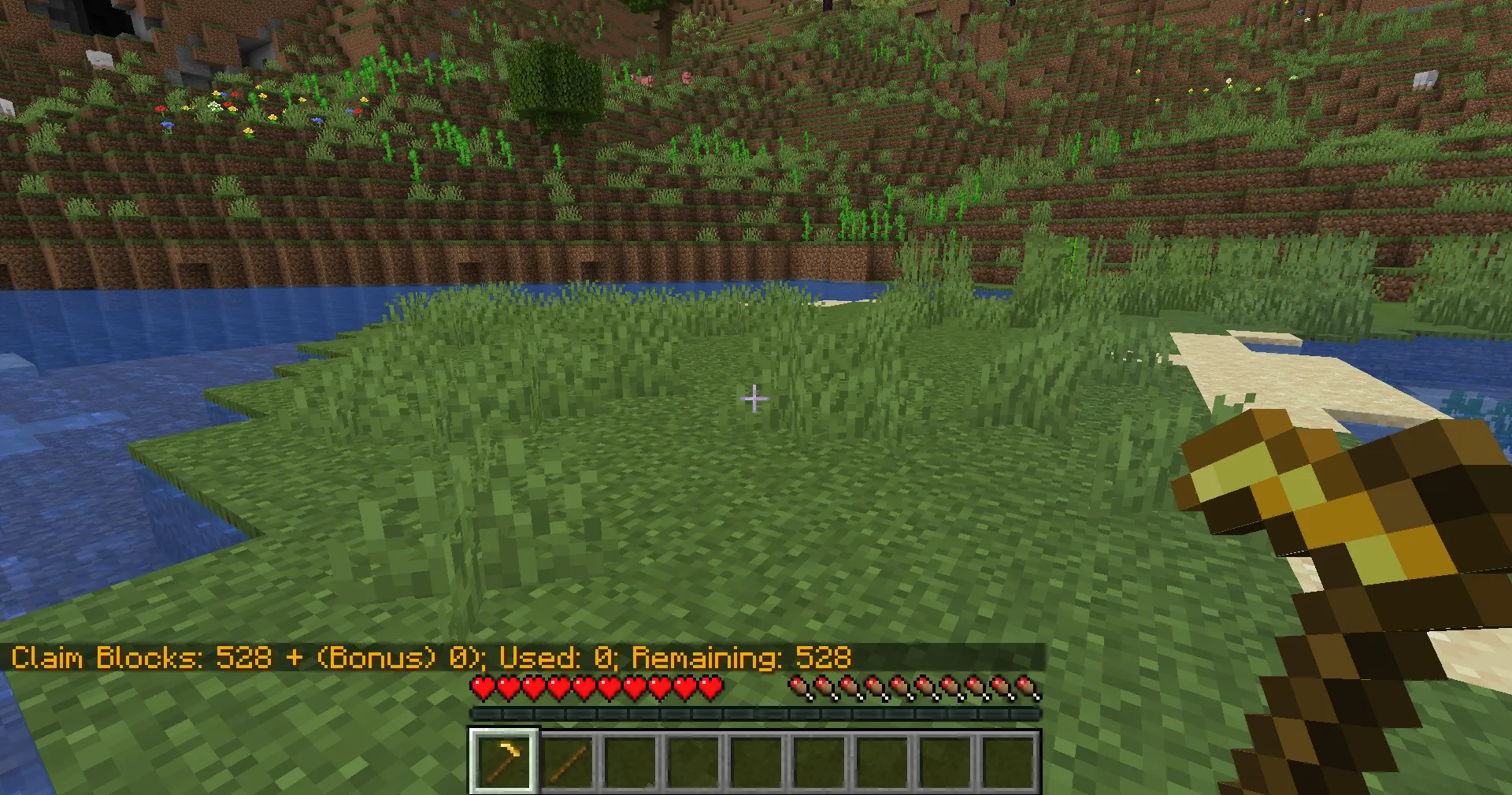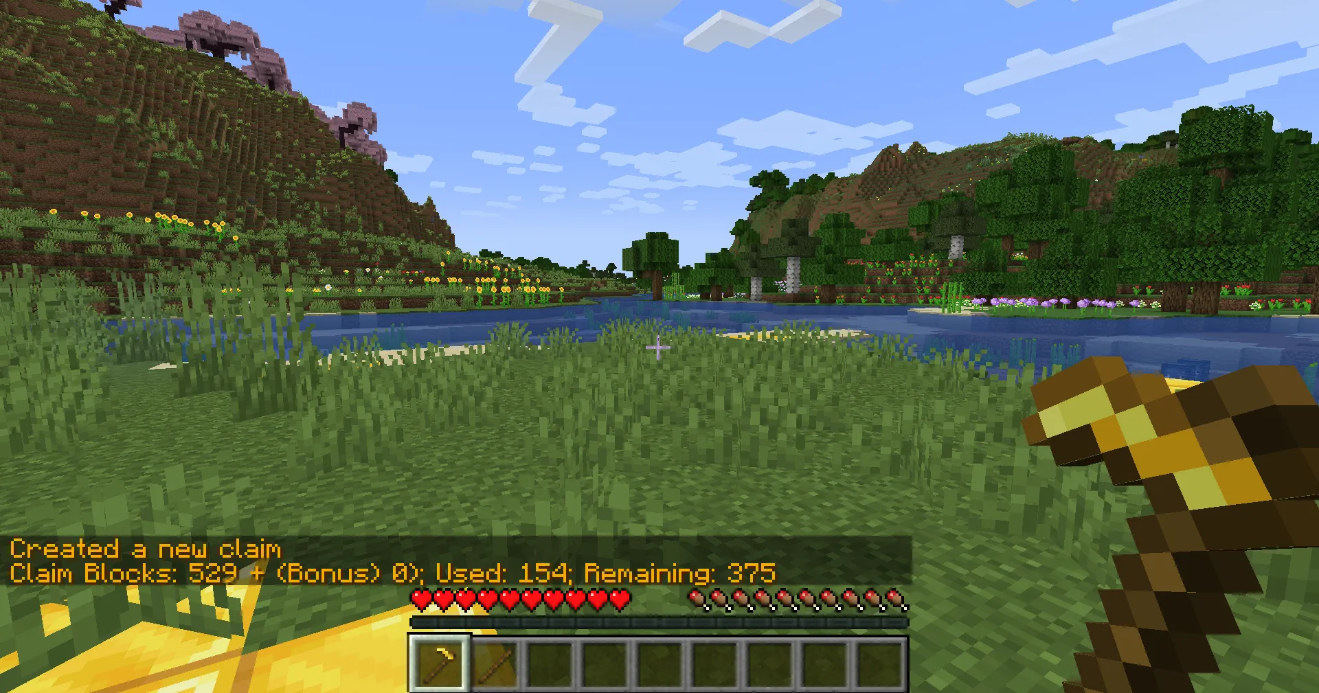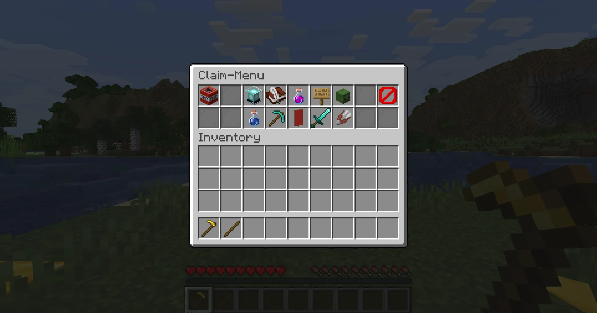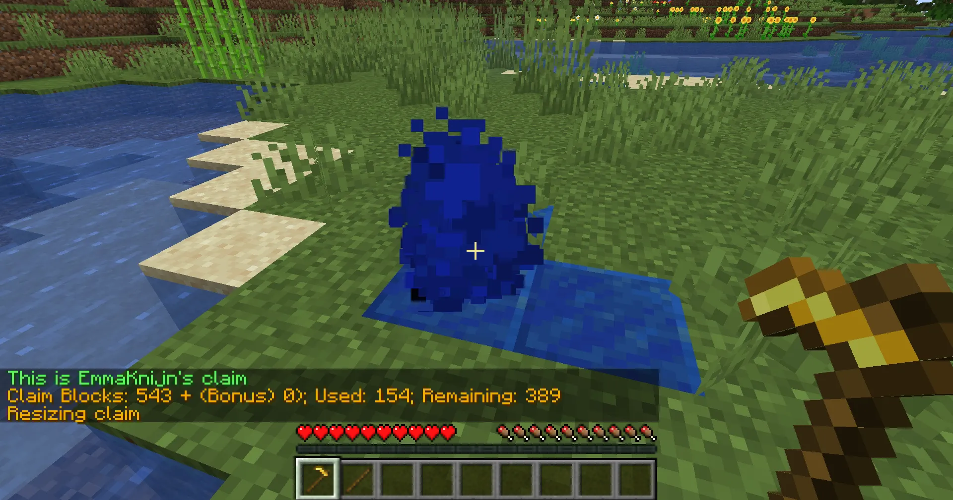 Section titled “Resizing a claim”To resize your claim, get a Golden Hoe and a Stick by crafting them or running /kit claim ck and selecting the claim kit (the golden hoe).